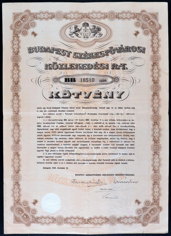 1930. "Budapest Székesfővárosi Közlekedési Rt" kötvénye szel... https://www.darabanth.com/hu/202-Gyorsarveres/202.0/Numizmatika/Reszvenyek-es-sorsjegyek~600006/1930-Budapest-Szekesfovarosi-Kozlekedesi-Rt-kotvenye-szelvenyekkel-TIII~II802775