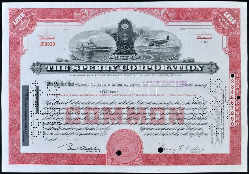 USA / Delaware 1955. "The Sperry Corporation" 15 shares, each with the value of 1$, holes C:XF