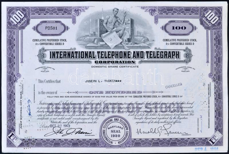 Amerikai Egyesült Államok / Maryland 1963-1964. "International Telephone And Telegraph Corporation" 3 részvénye + 100 részvénye egyenként 100$-ról pecsétekkel és lyukasztással T:I-,II