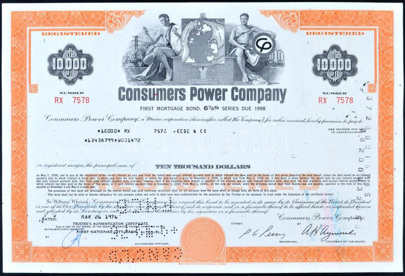Amerikai Egyesült Államok / Michigan 1976. "Consumers Power Company" áramszolgáltató cég 6 7/8%-os jelzálog kötvénye 10.000$ T:I