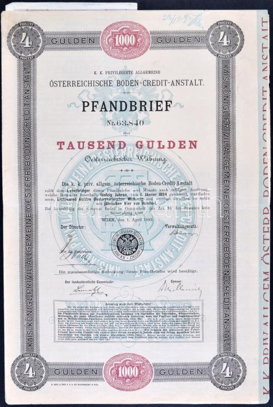 Leírás: Ausztria / Bécs 1893. "Österreichische Boden-Credit-Anstalt" záloglevél 1000G-ról szelvényekkel T:II