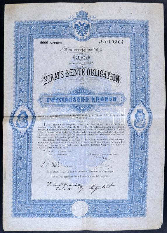 Leírás: Ausztria / Bécs 1897. 4%-os "Staats-Rente Obligation" kötvény 2000 Koronáról, szelvényekkel T:III