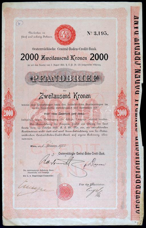 Leírás: Ausztria / Bécs 1902. "Österreichische Central-Noten-Creditbank" záloglevél 2000K-ról szelvényekkel T:III
