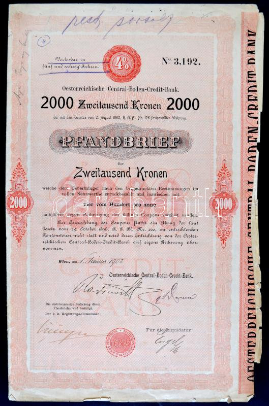Leírás: Ausztria / Bécs 1902. "Österreichische Central-Noten-Creditbank" záloglevél 2000K-ról szelvényekkel T:III