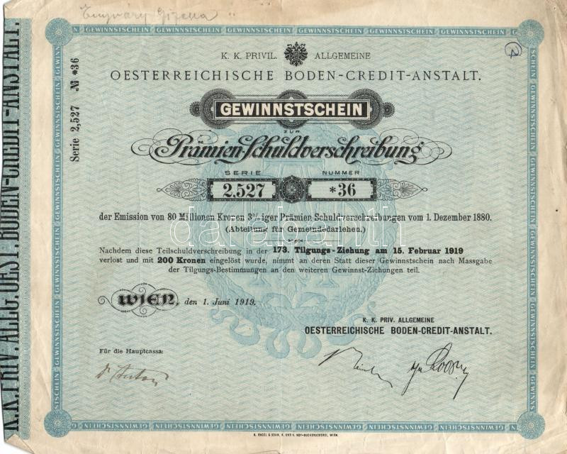 Leírás: Ausztria / Bécs 1919. "Österreichische Boden-Credit-Anstalt - Gewinnstschein" prémium kötvénye 200K-ról T:III
