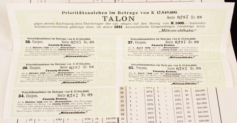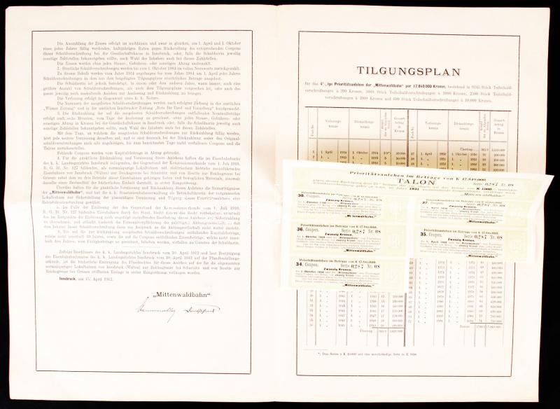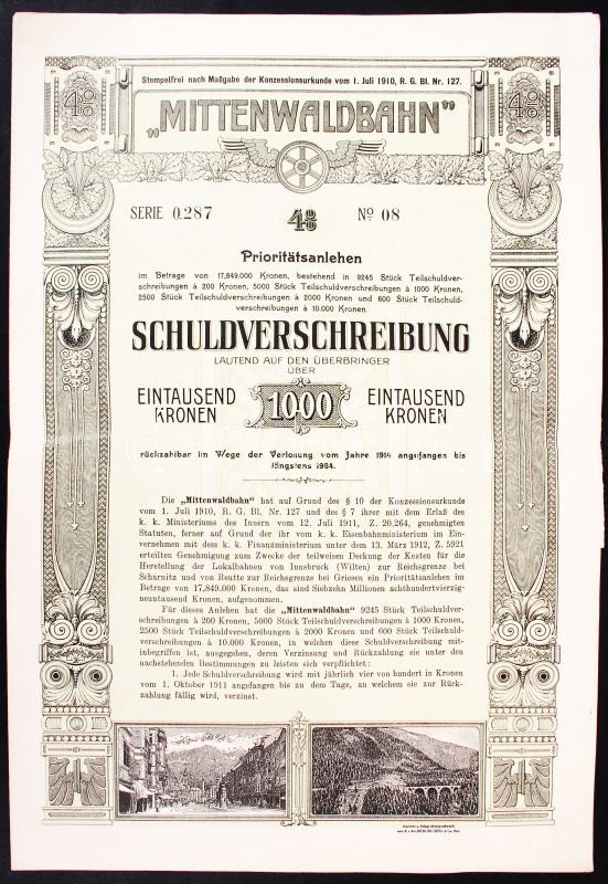 Austria / Innsbruck 1912. "Mittenwaldbahn" bond about 1000 Corona with coupons C:XF