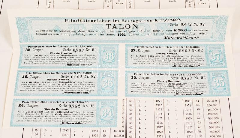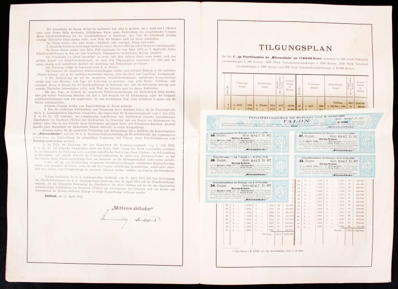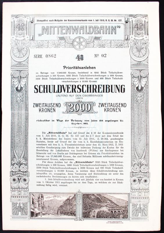 Austria / Innsbruck 1912. "Mittenwaldbahn" bond about 2000 Corona with coupons C:XF