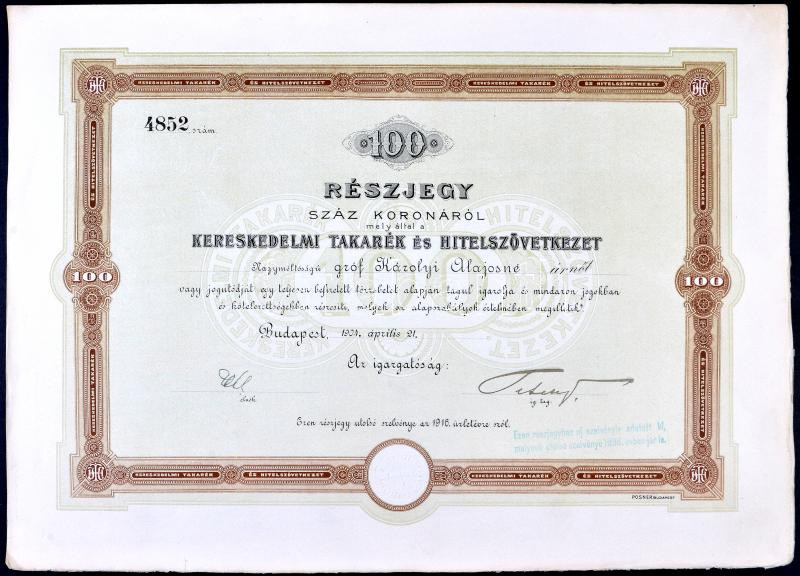 Budapest 1904. "Kereskedelmi Takarék és Hitelszövetkezet" ré... https://www.darabanth.com/hu/202-Gyorsarveres/202.0/Numizmatika/Reszvenyek-es-sorsjegyek~600006/Budapest-1904-Kereskedelmi-Takarek-es-Hitelszovetkezet-reszjegye-100K-rol-szelvenyekkel-T~II804217