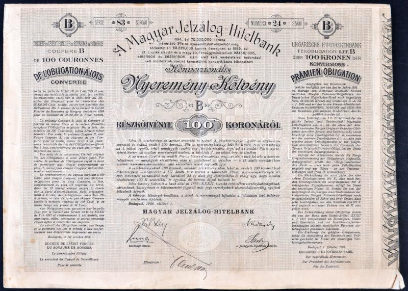 Leírás: Budapest 1906. "A Magyar Jelzálog-Hitelbank" nyereménykötvénye "B" 100K-ról, 3 nyelven T:II-
