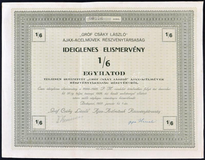 Leírás: Budapest 1927. "Gróf Csáky László Ajax-Acélművek Részvénytársaság" ideiglenes elismervénye 1/6 teljesen befizetett részvényről