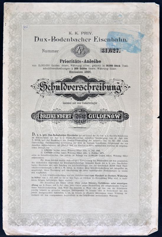 Leírás: Csehország/Teplitz 1891. "Dux-Bodenbachi Vasút" 4%-os elsőbbségi kötvénye 300G értékben + szelvények T:III