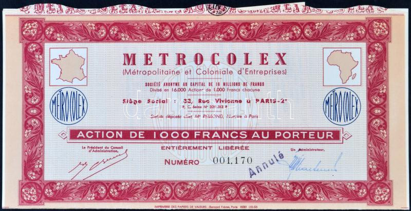 Leírás: Franciaország DN "Metrocolex" részvénye 1000Fr-ról szelvényekkel T:I