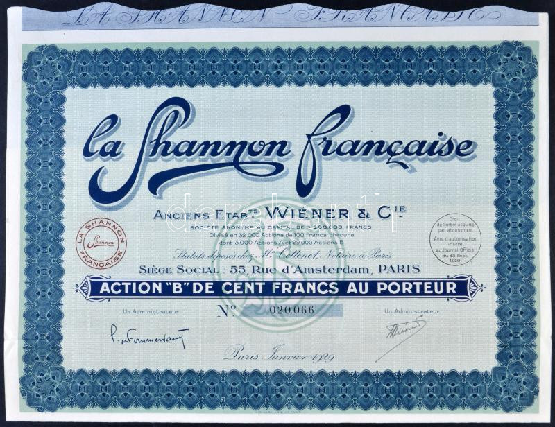 Franciaország / Párizs 1929. "La Shannon Francaise" "B" részvénye 100Fr-ról T:II