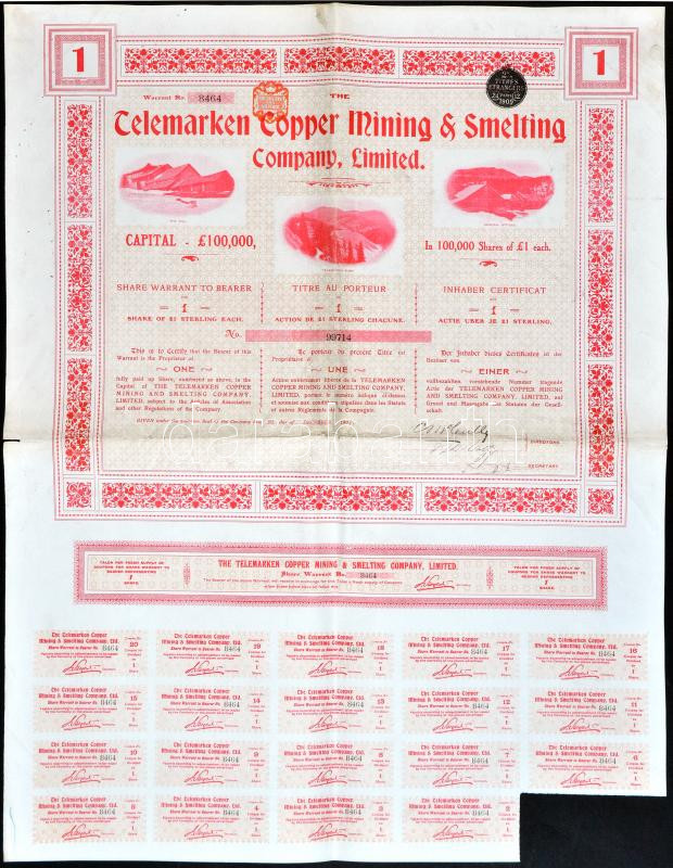 Nagy-Britannia 1906. "Telemarken" Rézbányászat- és Olvasztás Vállalat részvénye 1Ł-ról szelvényekkel T:III