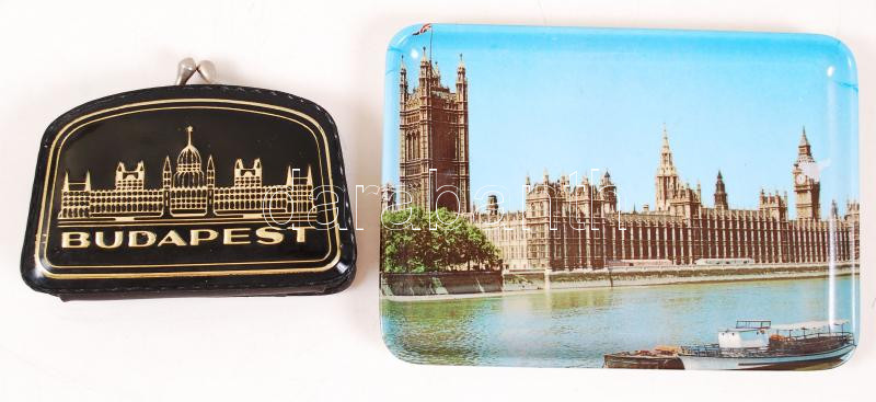 Leírás: Budapest feliratú retró pénztárca, 9x6 cm és a londoni parlamentet ábrázoló kis műanyag tálca, 15x10 cm