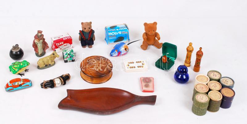 Leírás: Vegyes bolha tétel: játékok, bizsuk, vitrintárgyak, diafilmek, vegyes fémpénzek, kártya, plüssfigura.