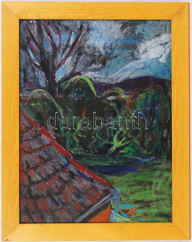 Leírás: D. Borbély Gizella (1920-1994): Kertvég. Vegyes technika, papír, jelzés nélkül, üvegezett keretben 52×39 cm