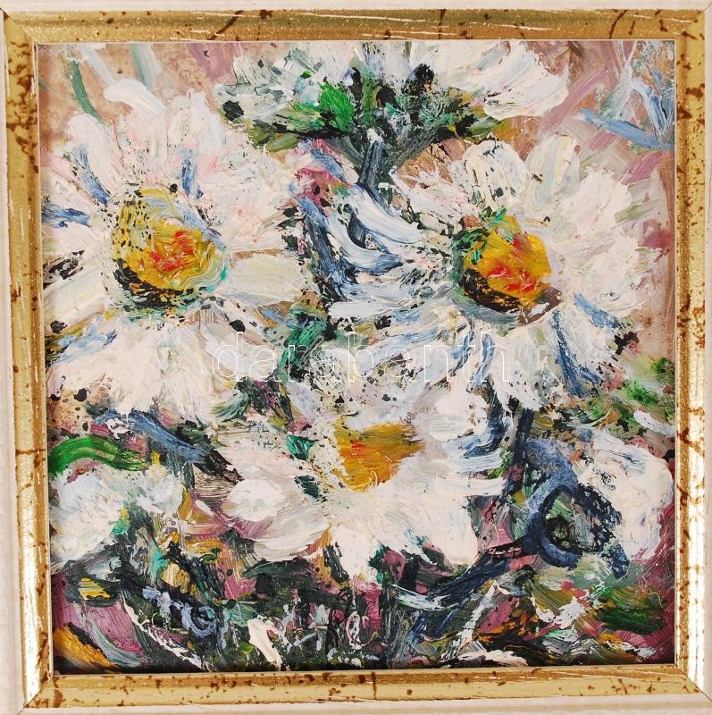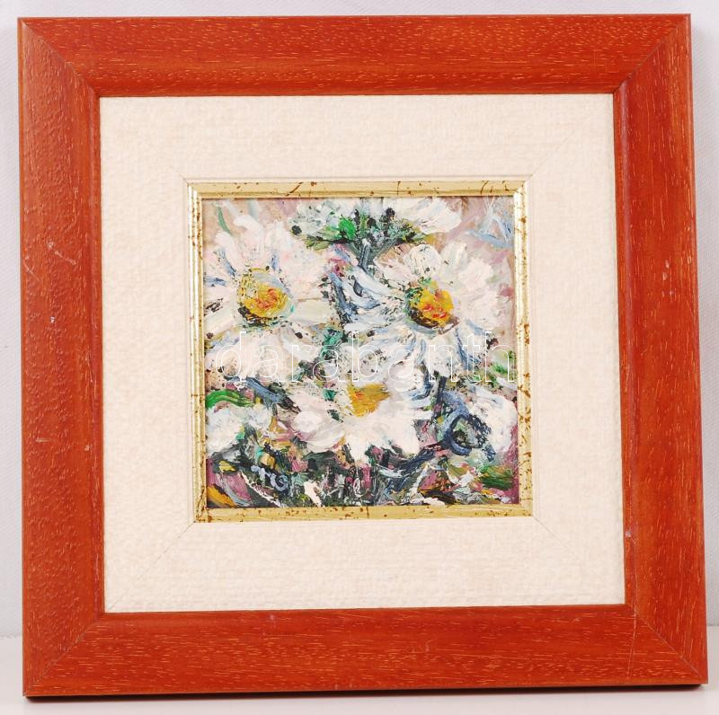 Leírás: Tarcsányi Otília: Margaréták. Olaj, farost, jelzett, újszerű keretben, 13×9 cm