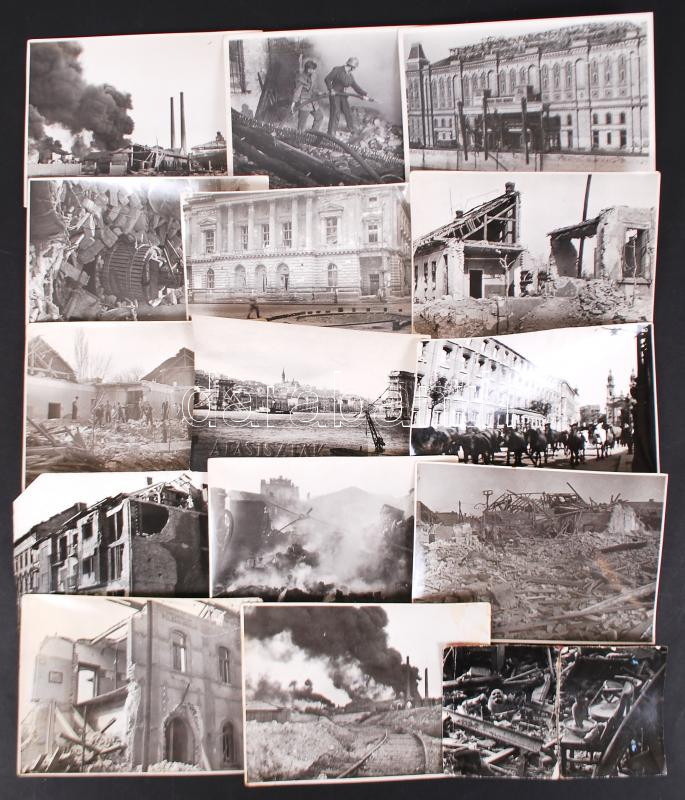 1944-1945 21 db kfl méretű fénykép Bp-ről, a háborús pusztításokról, Tiszavölgyi József hagyatékából, néhány feliratozva, többsége pecséttel jelezve; 9x8 cm és 13x18 cm közötti képméretek