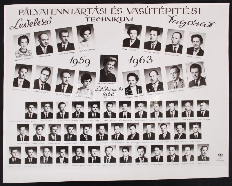 Leírás: 1963 Pályafenntartási és Vasútépítési Technikum levelező tagozatának végzős hallgatói, a tablóképen 54 portrékép, névaláírásokkal, 23x30 cm