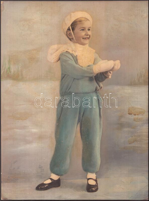 Leírás: cca 1950-1960 Demeter fotó (Szentes): Havas táj a műteremben, kézzel színezett, átfestett gyermekfotó, 23x17 cm