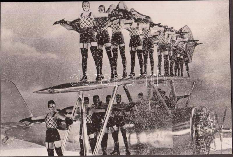 Leírás: cca 1960-1970 Tánckar a repülőgép szárnyán, műtermi illúzió, festett háttér előtt, 16x23 cm