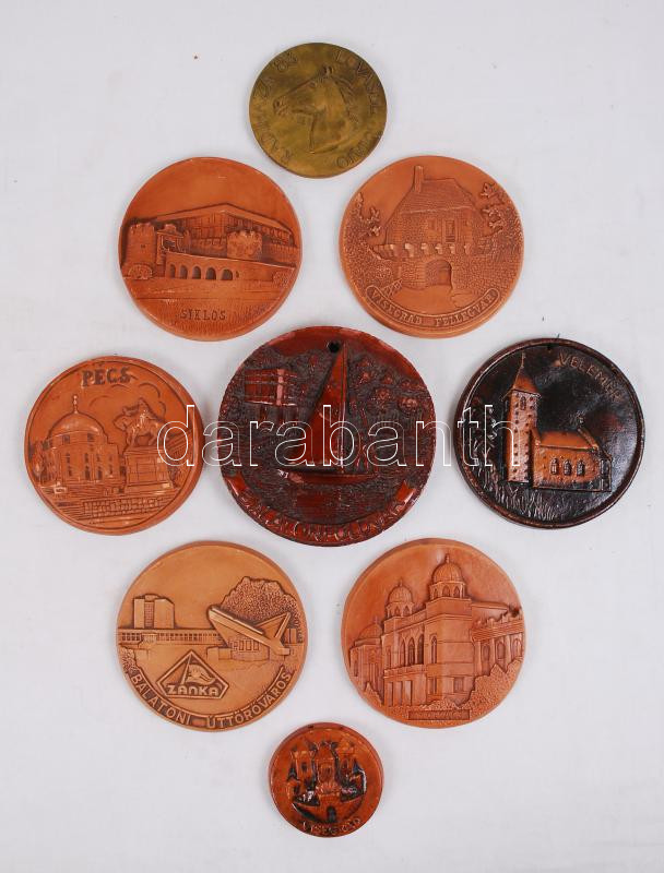 Leírás: 9 db kerámia plakett különböző magyar városokból, d: 7 és 14 cm között.