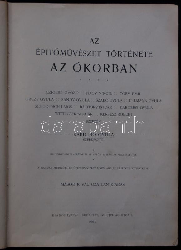 Az építőművészet története I. Ókor. Szerk. Kabdebo Gyula. Bp., 1904, a szerzők kiadása. Aranyozott egészvászon kötésben (a gerincen szakadt), gazdag képanyaggal