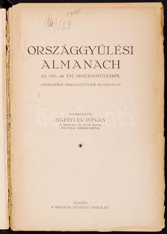Országgyűlési almanach az 1935-40. évi országgyűlésről. Szerkesztette Haeffler István.