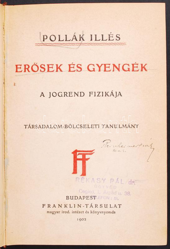 Pollák Illés: Erősek és gyengék - a jogrend fizikája Bp., 1903. Frankl... https://www.darabanth.com/hu/203-Gyorsarveres/203.0/Festmeny-mutargy-papirregiseg-egyeb/Konyvek-Jog~200040/Pollak-Illes-Erosek-es-gyengek--a-jogrend-fizikaja-Bp-1903-Franklin-Felvaszon-kotesb~II807699