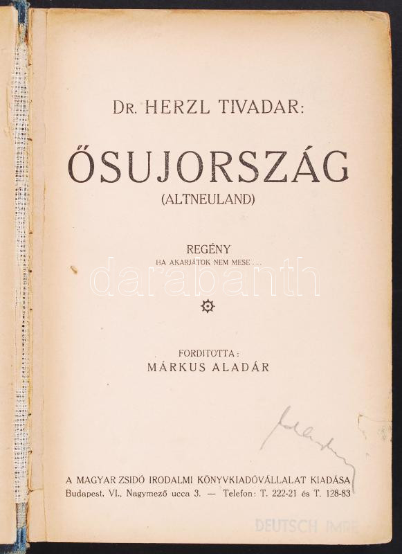 Herzl Tivadar.: Ősujország. (Altneuland.) Regény, ha akarjátok nem mes... https://www.darabanth.com/hu/203-Gyorsarveres/203.0/Festmeny-mutargy-papirregiseg-egyeb/Konyvek-Judaika~200028/Herzl-Tivadar-Osujorszag-Altneuland-Regeny-ha-akarjatok-nem-mese238230-Ford-Markus-Ala~II798703