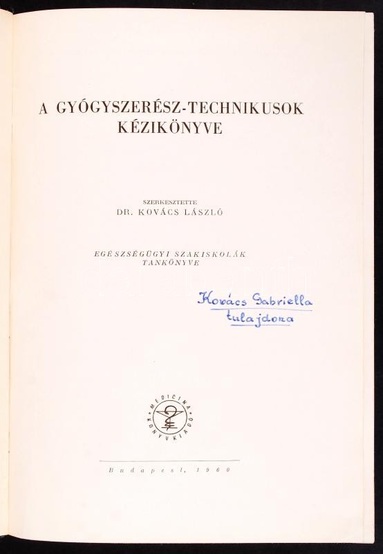 Dr. Kovács László: A gyógyszerésztechnikusok kézikönyve Bp., 1960. Med... https://www.darabanth.com/hu/203-Gyorsarveres/203.0/Festmeny-mutargy-papirregiseg-egyeb/Konyvek-Konyha-es-kert~200033/Dr-Kovacs-Laszlo-A-gyogyszeresztechnikusok-kezikonyve-Bp-1960-Medicina~II807299
