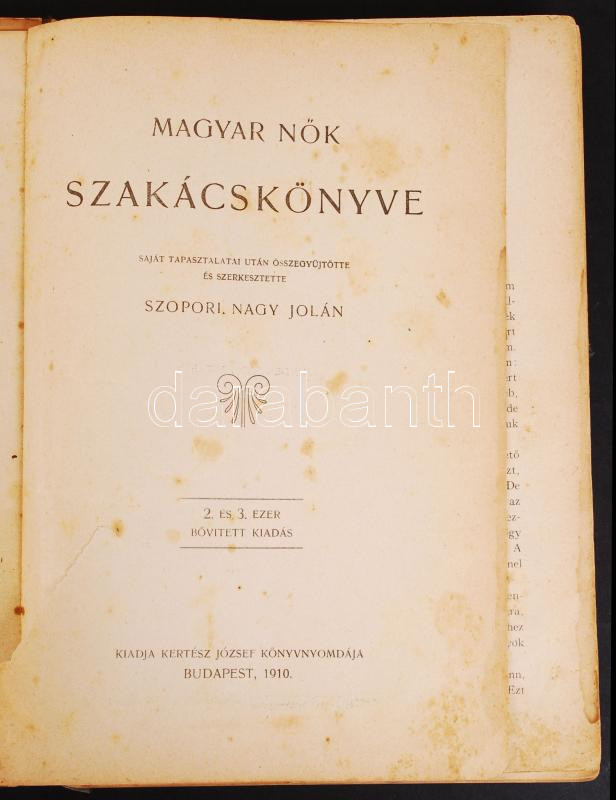 Szopori Nagy Jolán: Magyar nők szakácskönyve. Bp., 1910, Kertész Józse... https://www.darabanth.com/hu/203-Gyorsarveres/203.0/Festmeny-mutargy-papirregiseg-egyeb/Konyvek-Konyha-es-kert~200033/Szopori-Nagy-Jolan-Magyar-nok-szakacskonyve-Bp-1910-Kertesz-Jozsef-Konyvnyomdaja-Felv~II808936