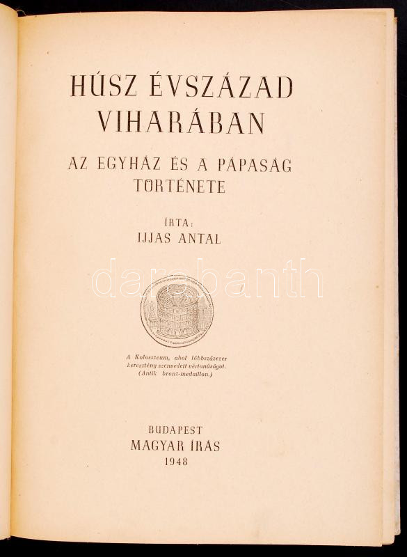 Ijjas Antal: Húsz század viharában az egyház és a pápaság története Bp... https://www.darabanth.com/hu/203-Gyorsarveres/203.0/Festmeny-mutargy-papirregiseg-egyeb/Konyvek-Tortenelem~200029/Ijjas-Antal-Husz-szazad-viharaban-az-egyhaz-es-a-papasag-tortenete-Bp-1948-Magyar-Ira~II807317