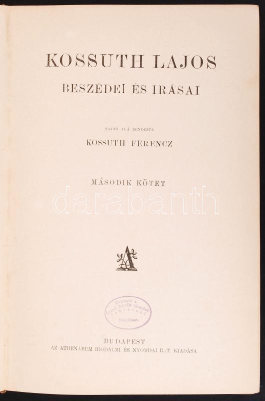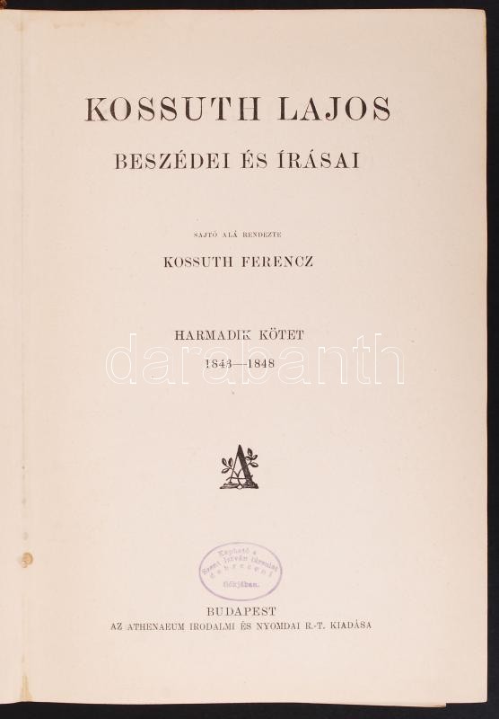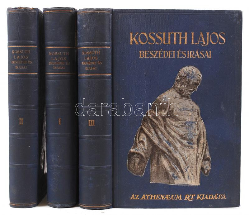 Leírás: Kossuth Lajos beszédei és írásai I-III. Sajtó alá rendezte: Kossuth Ferencz. Budapest é.n. Athenaeum. 1 kötet gerince meglazult, több lap kijár