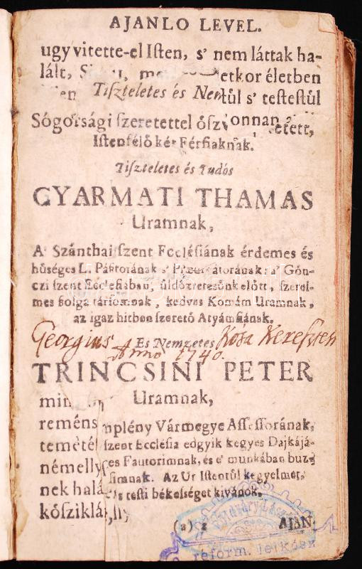 Szathmárnémeti Mihály: Halotti centuria az az 100 halotti predikációk. Kolosvárott, 1683. Újrakötve, korabeli félbőr kötésben. A gerinc sérült, lapszélek visszavágva, a címlap hiányzik, az 1., 9., 11. lap sérült, az első néhány oldalon ceruzás jelzések, az előzéklapokon az egykori tulajdonos tollas bejegyzései láthatók