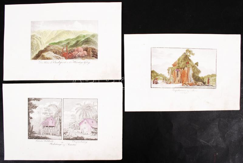 Leírás: cca 1800 3 db színezett rézmetszet a Indonéziáról, és a Himalájáról 14x8 cm