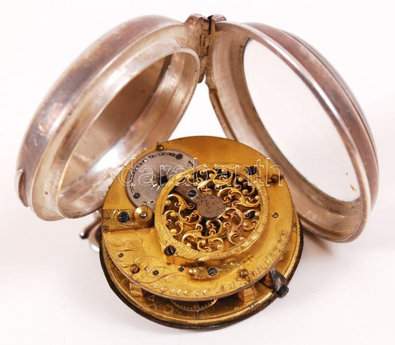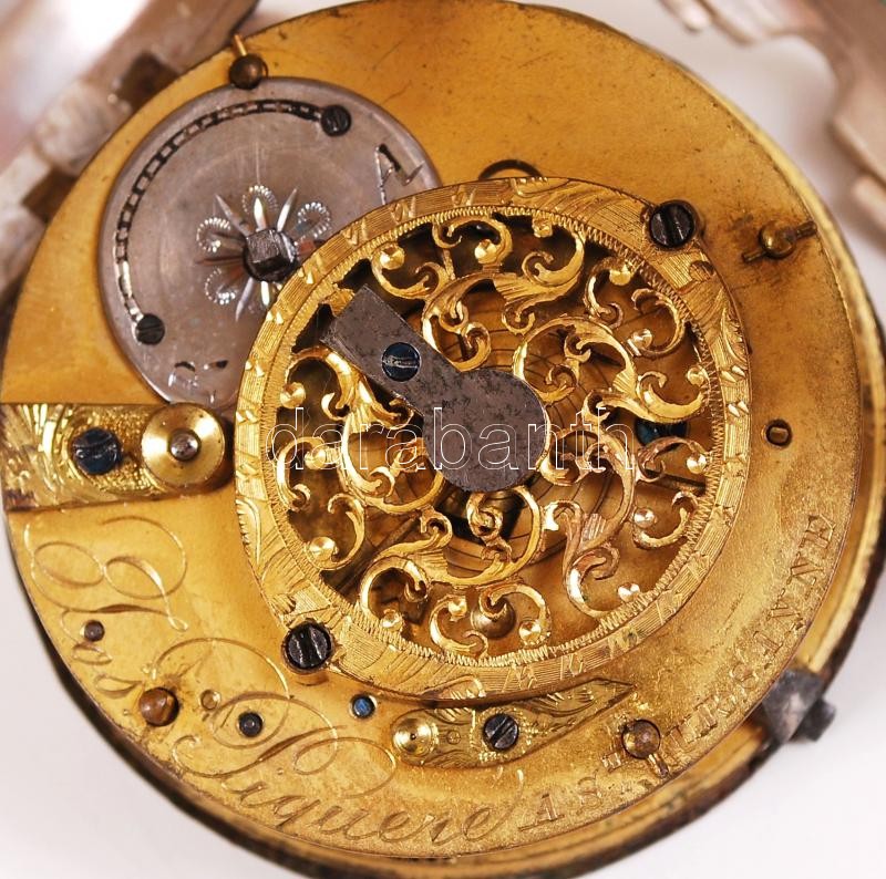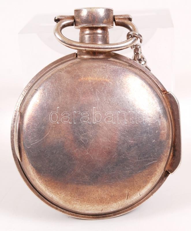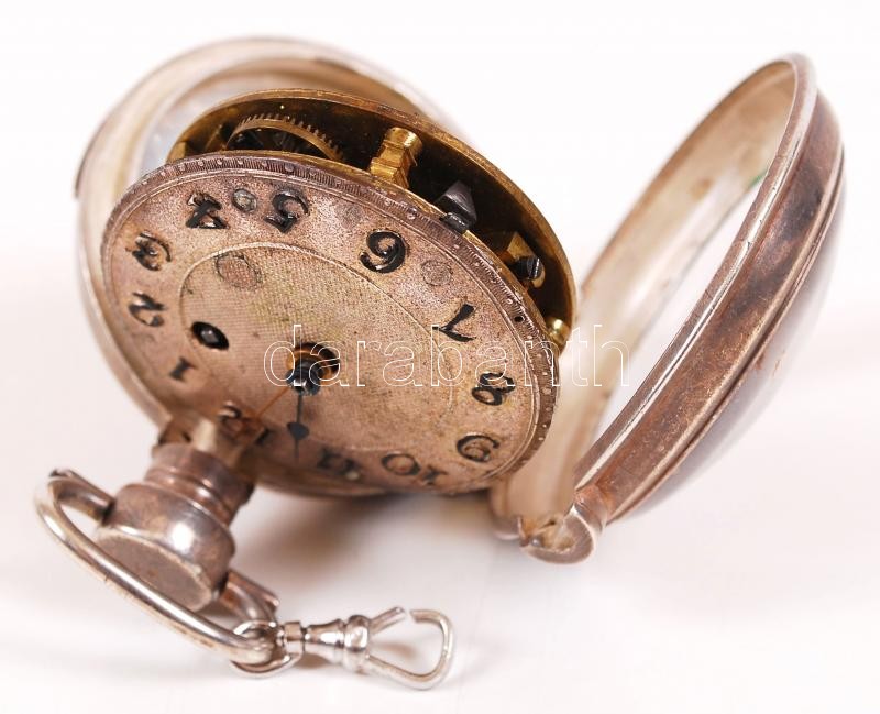 cca 1880 Spindli szerkezetű, elölkulcsos, üvegfedelű, ezüst (Ag) svájci zsebóra, arab számjegyű ezüst (Ag) számlappal, eredeti kulccsal, jól jár /
