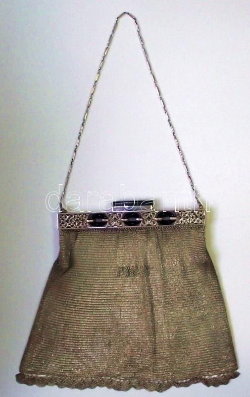cca 1940 800-as tisztaságjelű ezüst (Ag) horgolt láncszemes színházi táska fekete bakelitdíszítéssel (kis sérüléssel) /