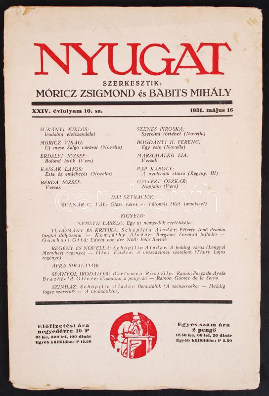 1931 Nyugat 1931 május, 24. évfolyam, 10. szám https://www.darabanth.com/hu/203-Gyorsarveres/203.0/Festmeny-mutargy-papirregiseg-egyeb/Nyomtatvanyok~200041/1931-Nyugat-1931-majus-24-evfolyam-10-szam~II810527