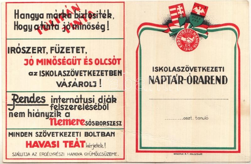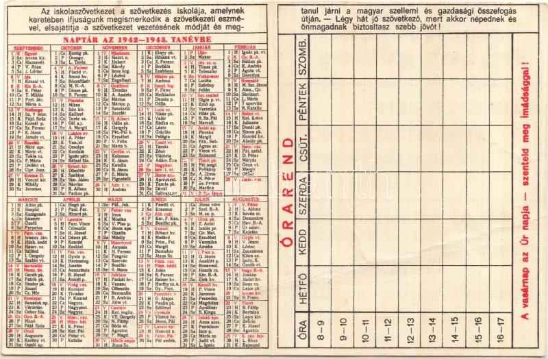 Leírás: 1942-1943 Erdélyrészi Hangya-Iskolaszövetkezeti naptár-órarend