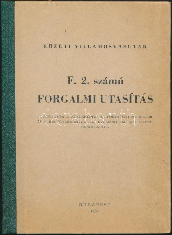 1968 Bp., Közúti villamosvasutak F.2. számú forgalmi utasítás, 141p. https://www.darabanth.com/hu/203-Gyorsarveres/203.0/Festmeny-mutargy-papirregiseg-egyeb/Nyomtatvanyok~200041/1968-Bp-Kozuti-villamosvasutak-F2-szamu-forgalmi-utasitas-141p~II809026