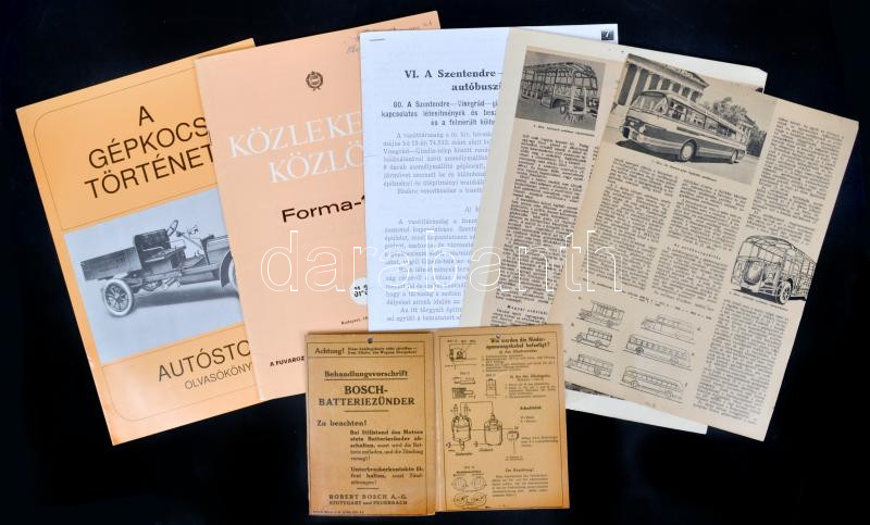 cca 1950-1994 Közlekedéssel kapcsolatos nyomtatványok, 5 db (A gépkocsi története, Közlekedési Közlöny, Világjáró Magyar Autóbuszok, Bosch Matteriezünder)
