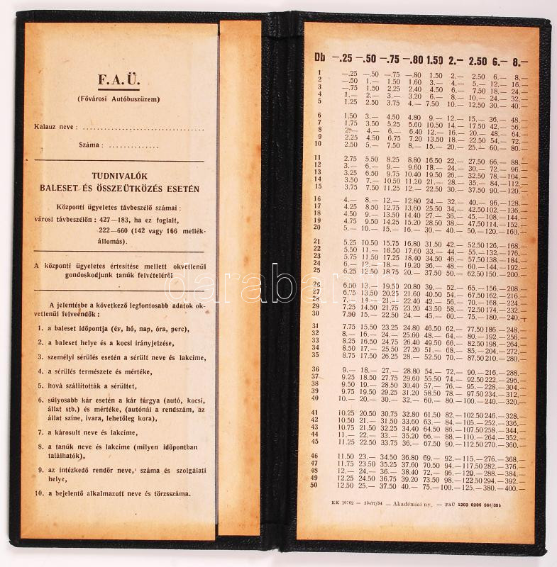cca 1950 Fővárosi Autóbuszüzem kalauzok mappája, viteldíjtételekkel https://www.darabanth.com/hu/203-Gyorsarveres/203.0/Festmeny-mutargy-papirregiseg-egyeb/Nyomtatvanyok~200041/cca-1950-Fovarosi-Autobuszuzem-kalauzok-mappaja-viteldijtetelekkel~II722832