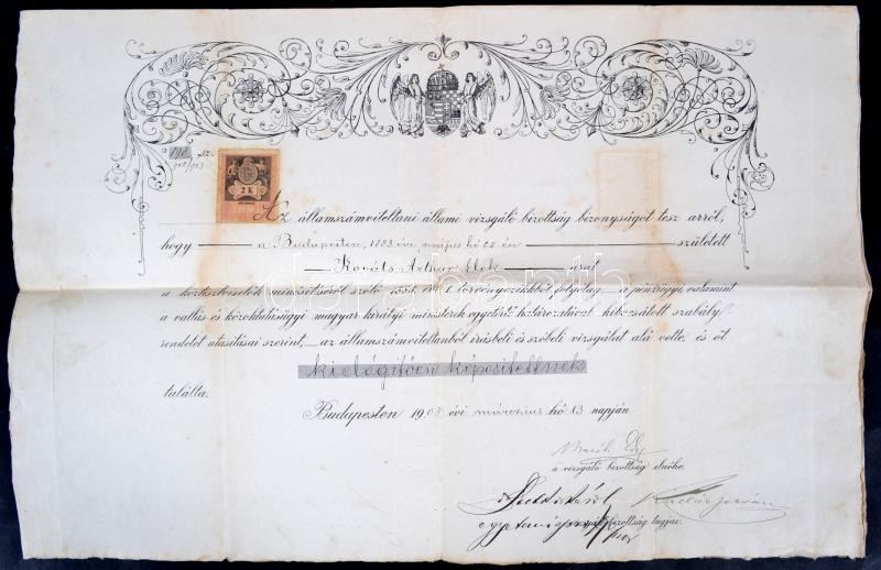 Leírás: 1903 Államszámviteli vizsgabizonyítvány 60x30 cm