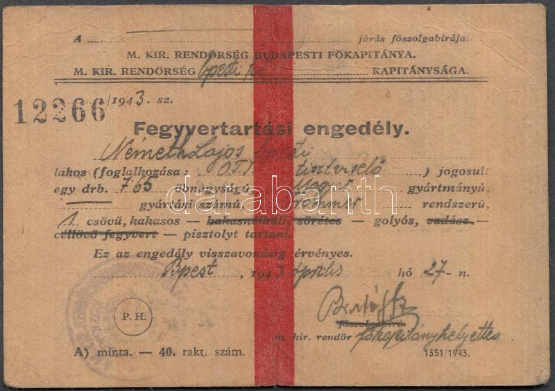 1943 Bp., Fegyvertartási engedély https://www.darabanth.com/hu/203-Gyorsarveres/203.0/Festmeny-mutargy-papirregiseg-egyeb/Okmanyok~200014/1943-Bp-Fegyvertartasi-engedely~II807586