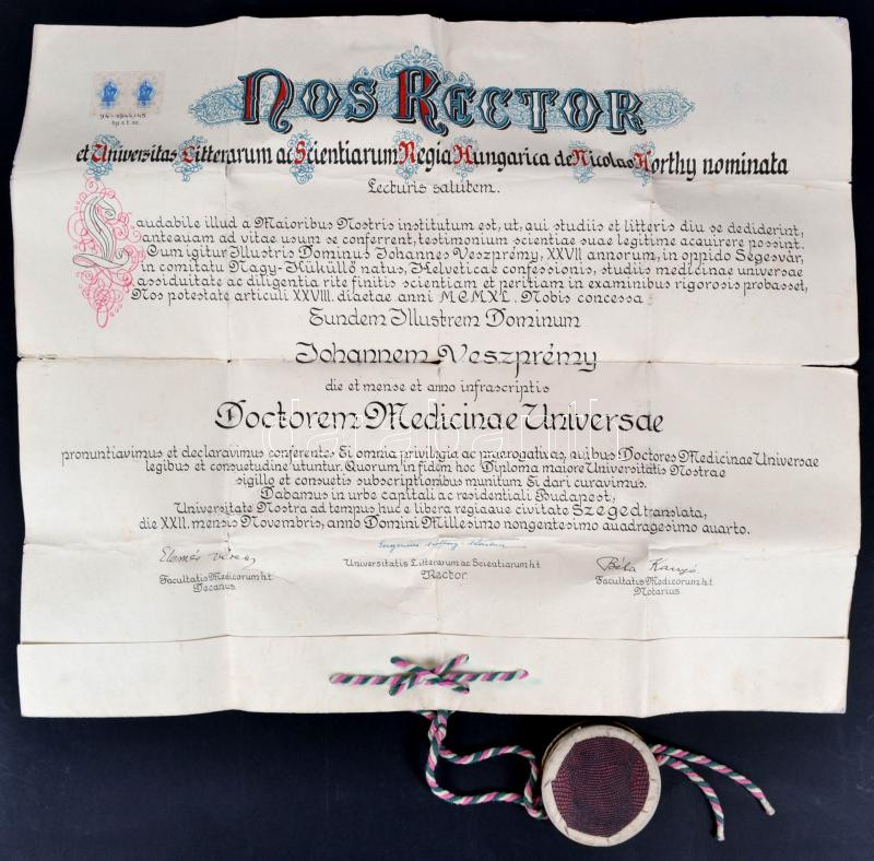 1944 Orvosi diploma viaszpecséttel / Doctors diploma https://www.darabanth.com/hu/203-Gyorsarveres/203.0/Festmeny-mutargy-papirregiseg-egyeb/Okmanyok~200014/1944-Orvosi-diploma-viaszpecsettel-Doctors-diploma~II807298