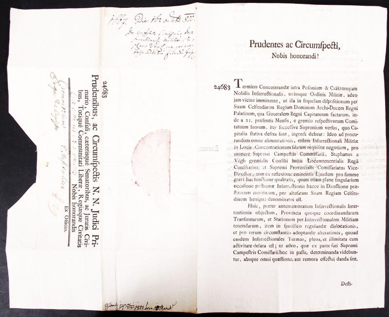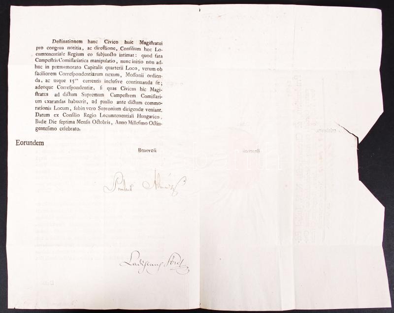 1800. október 7-én, Budán kelt helytartótanácsi levél: Pozsony, Csáktornya nemesei Sopron katonai felügyeletéről. Másfél oldal nyomtatott szöveg latin nyelven, eredeti aláírásokkal köztük Almássy Pál.