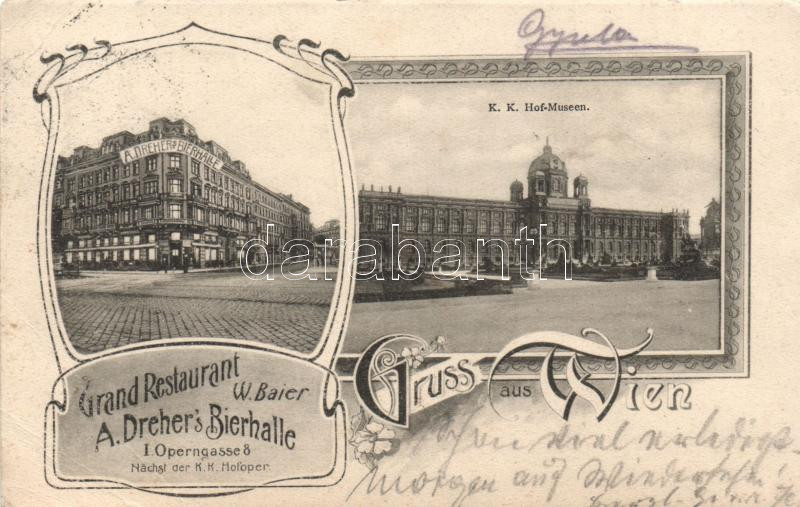 Leírás: Vienna, Wien; Grand Restaurant W. Baier, A. Dreher's Bierhalle, K.K. Hof-Museen, Art Nouveau (fa)