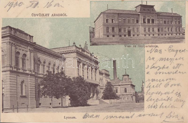 Arad, Líceum, Vas- és fémipariskola / Lyceum, school https://www.darabanth.com/hu/203-Gyorsarveres/203.0/Kepeslapok/Erdely~400008/Arad-Liceum-Vas-es-femipariskola-Lyceum-school~II806541